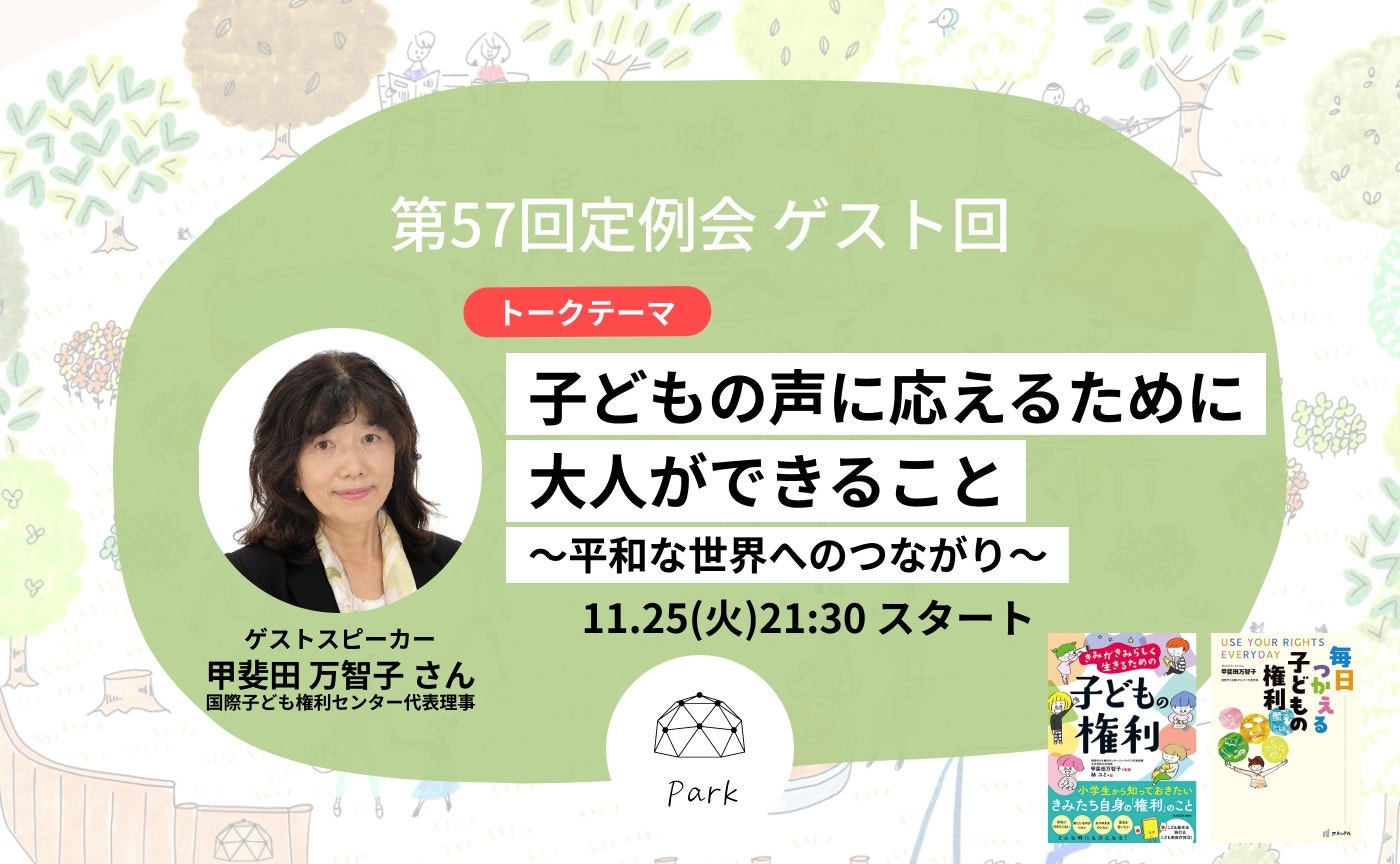 公式イベントである11月の定例会は、認定NPO法人国際子ども権利センター(C-Rights(シーライツ))代表理事の甲斐田万智子さんをゲストにお呼びして、「子どもの声に応えるために大人ができること〜平和な世界へのつながり〜」をテーマにお話しいただきました!